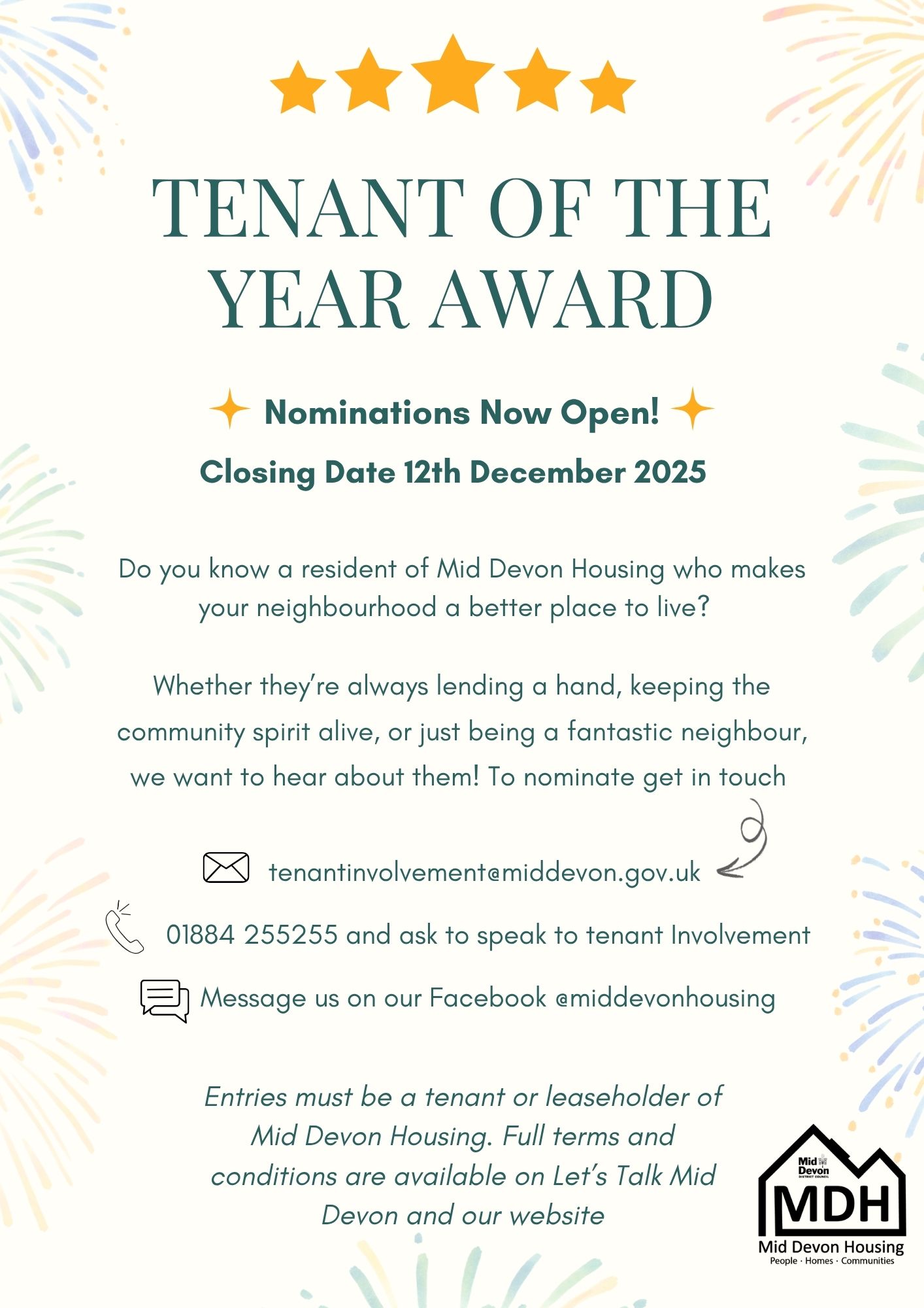 Do you know someone who is a Mid Devon Housing resident that makes a real difference? Whether they go the extra mile for neighbours, keep their home and garden looking great, or bring the community together, we want to hear about them! Nominations close on the 12th December 2025.